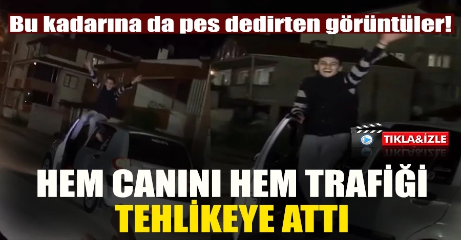 Trafiği tehlikeye atan ve adeta ölüme meydan okuyan genç sürücü bu anları sosyal medya hesabı üzerinden de paylaştı. Görüntülerde ilerleyen aracın sürücü koltuğundan dışarıya çıkan gencin müzik eşliğinde oynadığı anlar yer aldı.