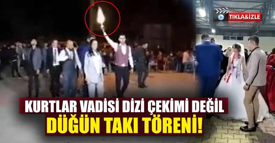 7’den 70’e insanların olduğu düğünde gerçekleşen magandalık anları ise sosyal medyadan paylaşıldı. Sosyal medyadan paylaşılan görüntülerde, grubun Kurtlar Vadisi müziği eşliğinde havaya ateş ederek takı törenine doğru ilerlediği anlar yer alıyor.