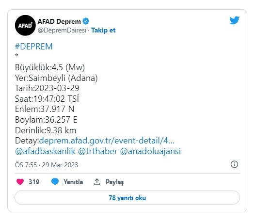 Adana'nın Saimbeyli ilçesinde 11 dakika arayla 3,9 ve 4,5 büyüklüğünde iki deprem meydana geldi.