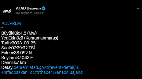 Afet ve Acil Durum Yönetimi Başkanlığı’nın (AFAD) internet sitesinde yer alan bilgiye göre, Kahramanmaraş’ın Ekinözü ilçesinde 4,5 büyüklüğünde sarsıntı kaydedildi.Saat 07.39'da olan deprem, yerin 7 kilometre derinliğinde gerçekleşti.