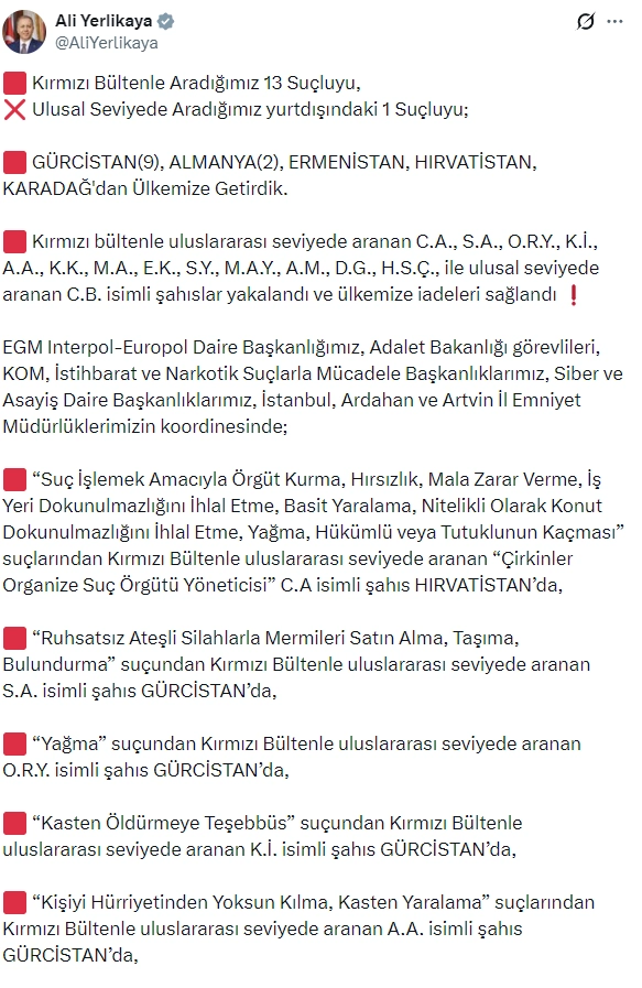 Gürcistan’da yakalanan kırmızı bültenle aranan S.A.’nın ruhsatsız ateşli silahlarla mermi satın alma, taşıma ve bulundurma suçundan arandığı ifade edildi. Aynı ülkede yakalanan O.R.Y.’nin yağma, K.İ.’nin kasten öldürmeye teşebbüs, A.A.’nın kişiyi hürriyetinden yoksun kılma ve kasten yaralama, K.K.’nin ise kasten öldürme ve yağma suçlarından arandığı kaydedildi.
