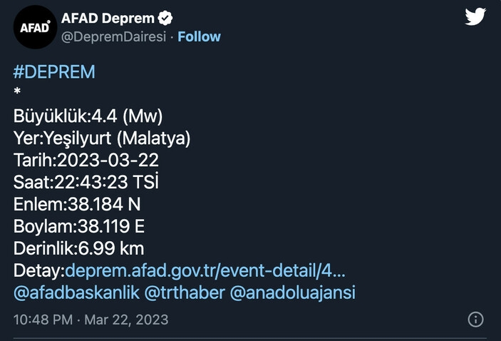 Afet ve Acil Durum Yönetimi Başkanlığının (AFAD) internet sitesinde yer alan bilgilere göre deprem 6.99 km derinlikte gerçekleşti.