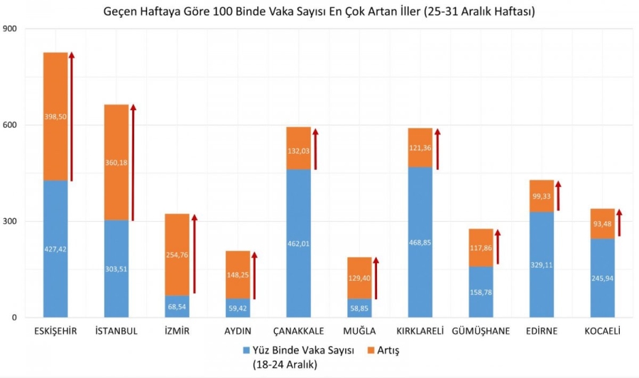 Sağlık Bakanı Fahrettin Koca, Twitter hesabından 25-31 Aralık arasında her 100 bin kişide görülen vaka sayısını açıkladı.