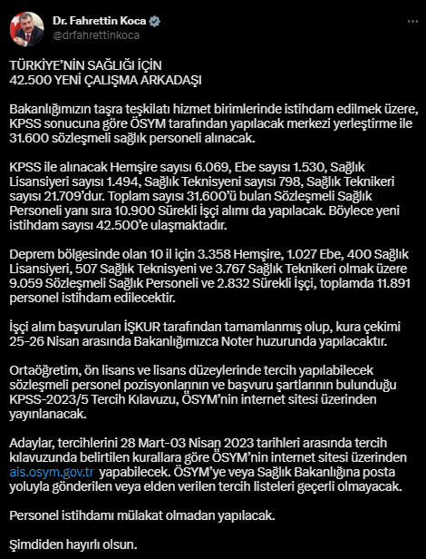 Resmi Gazete’de yayımlanan ilana göre, Sağlık Bakanlığı taşra teşkilatı hizmet birimlerinde istihdam edilmek üzere 31 bin 600 sözleşmeli sağlık personeli Kamu Personeli Seçme Sınavı (KPSS) sonucuna göre ÖSYM tarafından yapılacak merkezi yerleştirme ile alınacak.