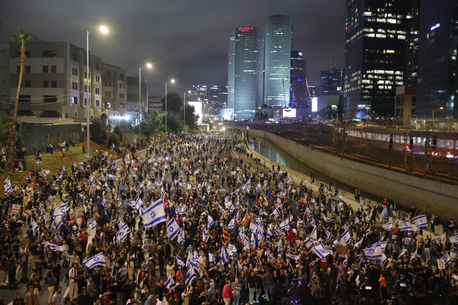 İsrail’de tartışmalı yargı reformuna yönelik protestolar devam ediyor. İsrail Başbakanı Binyamin Netanyahu, yargı reformuna karşı çıkan Savunma Bakanı Yoav Gallant'ı görevden almasının ardından halk yeniden sokaklara döküldü. Ellerinde İsrail bayrakları ile sokağa inen göstericiler, başkent Tel Aviv’deki Ayalon Otoyolu'nu trafiğe kapatarak ateş yaktı.