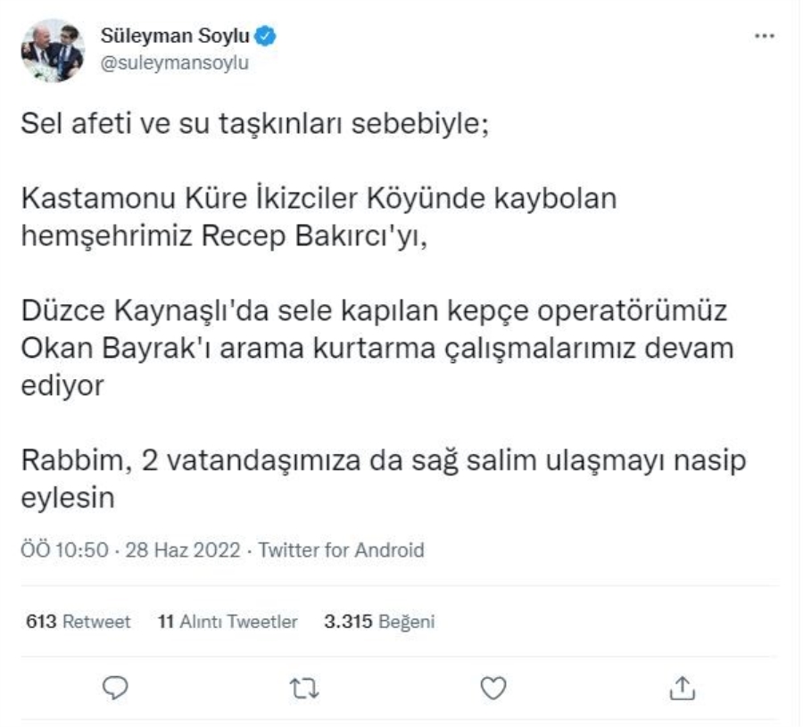 İçişleri Süleyman Soylu da Küre’de sele kapılan Recep Bakırcı için sosyal medya hesabından açıklama yaptı. Bakan Soylu yaptığı açıklamasında, “Sel afeti ve su taşkınları sebebiyle; Kastamonu Küre İkizciler köyünde kaybolan hemşehrimiz Recep Bakırcı'yı, Düzce Kaynaşlı'da sele kapılan kepçe operatörümüz Okan Bayrak'ı arama kurtarma çalışmalarımız devam ediyor Rabbim, 2 vatandaşımıza da sağ salim ulaşmayı nasip eylesin” ifadelerine yer verdi.
