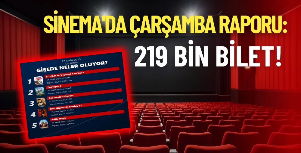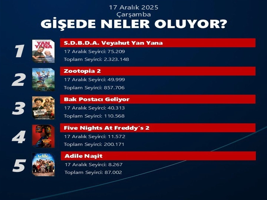 Sinema Genel Müdürlüğü'nün sosyal medya hesabından yapılan açıklamasında, "Çarşamba, hafta sonunu geride bıraktı. 17 Aralık Çarşamba günü sinema gişesinde toplam 219 bin 914 bilet satıldı ve hafta sonu gişesinin önüne geçti. 2025’in en çok izlenen filmi 'S.D.B.D.A. Veyahut Yan Yana', gişedeki liderliğini sürdürdü. S.D.B.D.A. Veyahut Yan Yana; 75 bin 209 bilet, Zootopia 2; 49 bin 999 bilet, Bak Postacı Geliyor; 40 bin 313 bilet, Five Nights at Freddy’s 2; 11 bin 572 bilet, Adile Naşit; 8 bin 267 bilet. Hafta sonu yoğunluğunu çarşamba gününe taşıyan bu kampanyayı kaçırmayın" ifadelerini kullandı.