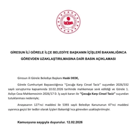 İçişleri Bakanlığı, Giresun’un Görele ilçesi Belediye Başkanı Hasbi Dede’nin görevinden uzaklaştırıldığını açıkladı. Dede’nin, “çocuğa karşı cinsel taciz” suçlamasıyla tutuklanmasının ardından geçici tedbir kararı alındığı bildirildi.