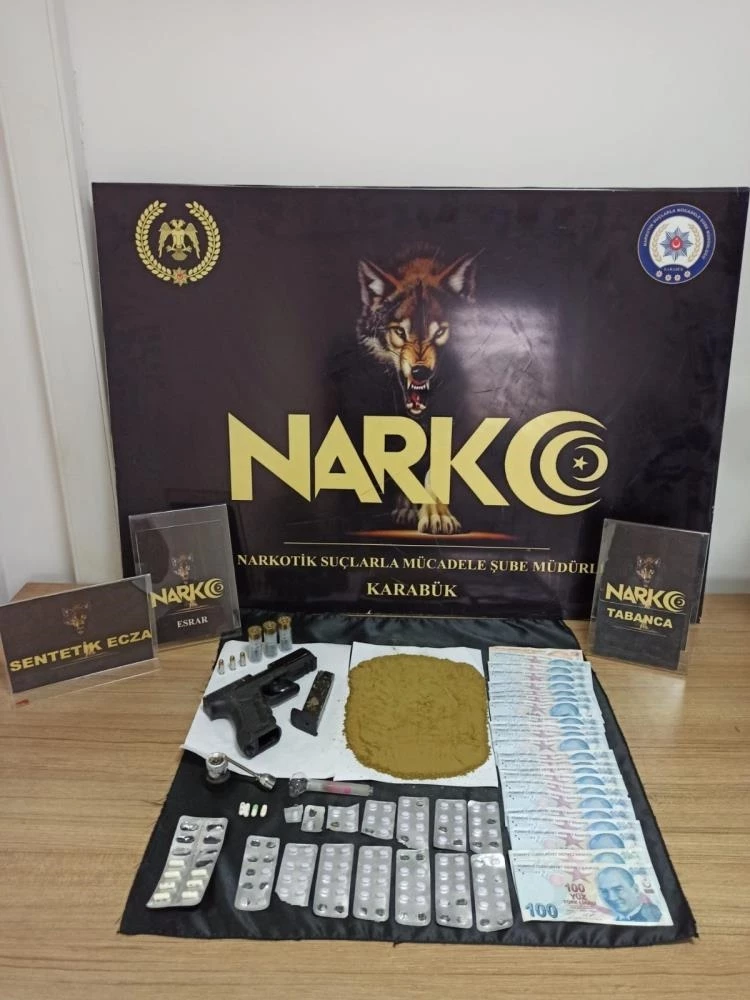 Karabük İl Emniyet Müdürlüğüne bağlı İstihbarat ve Narkotik Suçlarla Mücadele Şube Müdürlüğü ekipleri uyuşturucu ile mücadele çerçevesinde ilde eş zamanlı operasyonlar gerçekleştirdi. Yapılan operasyonlarda 83 adet hap (sentetik ecza), 89,31 gram toz esrar maddesi, 1 adet cam aparat (bong), 1 adet aparat (lüle), uyuşturucu madde ticaretinde kullanıldığı değerlendirilen 2 bin 250 TL para, 1 adet ruhsatsız tabanca, 3 adet tabanca mermisi (7,65mm), 3 adet av tüfeği fişeği ele geçirildi. Emniyetteki işlemlerinin ardından adliyeye sevk edilen şüphelilerden 2’si çıkarıldıkları adli makamlarca tutuklanırken, 2 şahıs ise yurt dışına çıkış yasağı ve adli kontrol şartı ile serbest bırakıldı.